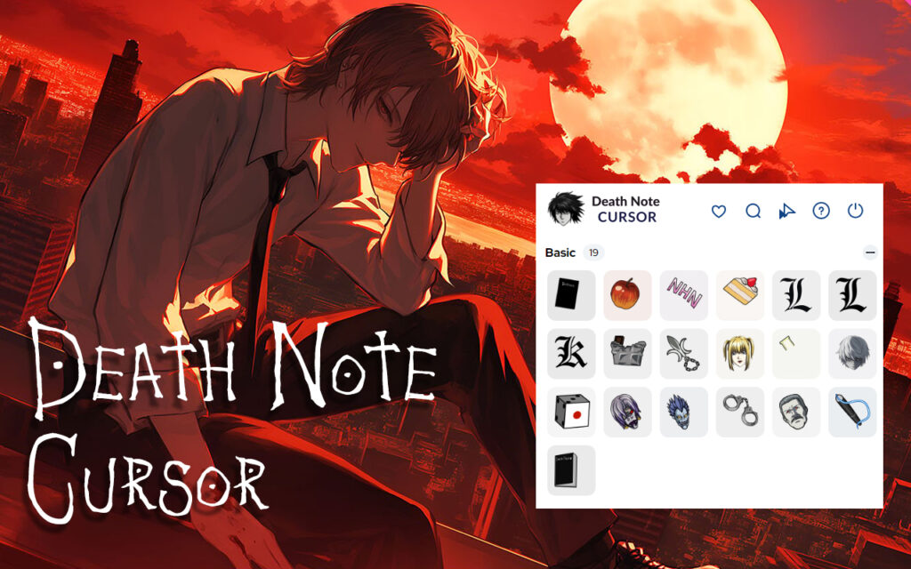 Choose from a variety of iconic cursor designs inspired by the Death Note, Kira, and the Shinigami world.
